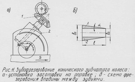 Заготовку I конического зубчатого колеса устанавливают на оправке в шпиндель делительной головки 2 (рис. 11,а), который поворачивают в вертикальной плоскости до тех пор, пока образуются