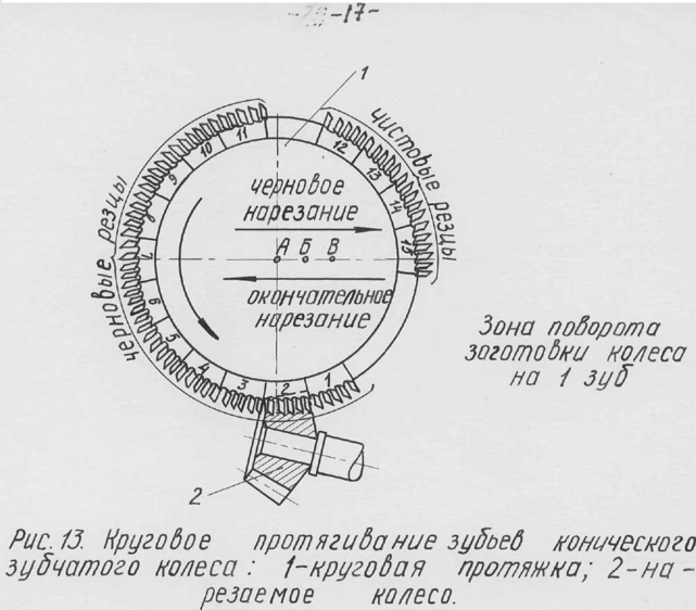 Для обработки прямых зубьев небольших конических колес применяют производительный метод - круговое протягивание зубьев на специальных зубопротяжных станках (рис. 13 ). Режущим инструментом служит круговая протяжка I, состоящая из нескольких секций фасонных резцов (15 секций по пяти резцов в каждой секции).