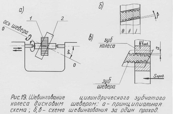 Шевингование. Шевингованием называется процесс чистовой отделки зубьев незакаленного зубчатого колеса, заключающийся в снятии (соскабливании) очень мелких волосообразных стружек толщиной 0,001 - 0,005 мм, благодаря чему значительно исправляются эксцентриситет начальной окружности, ошибки в шаге, в профиле эвольвенты, в угле подъема винтовой линии, а также повышается чистота боковой поверхности зубьев.