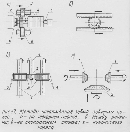 Принципиальная схема стана для накатывания конических зубчатых колес ясна из рис. 17,г . Сближение валков I, несущих конические шестерни-накатники, с заготовкой 2 до момента совпадения вершин их конусов получаем на нагретой заготовке зубья.