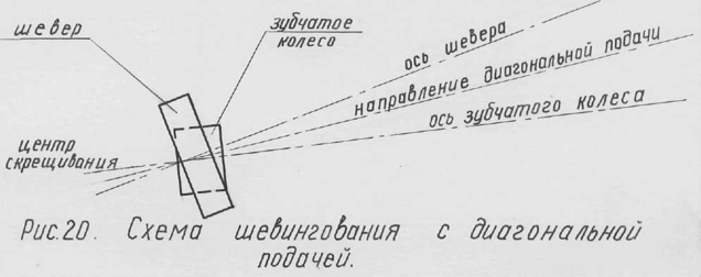 Широкое применение находит производительный метод шевингования с диагональной подачей. Этот метод предусматривает поступательное перемещение обрабатываемого зубчатого колеса не параллельно его оси, а под углом