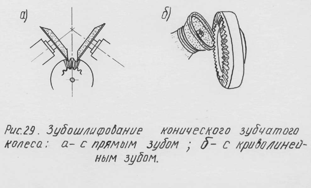 Криволинейные зубья конических зубчатых колес шлифуются чашечный абразивным кругом (рис. 29,б ). Сечение боковой стороны круга должно иметь профиль зуба рейки чашечный круг, вращаясь со скоростью 20-30 м/с, обкатывает рабочую поверхность профиля шлифуемого зуба.