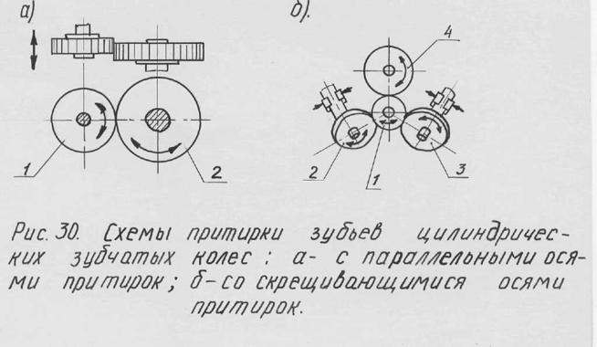 По первому способу притирка колеса I (рис. 30,а) производится одним притиром 2 того же модуля.