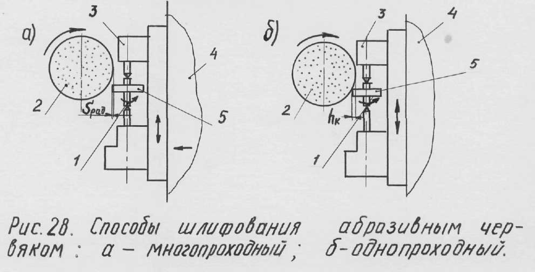 Суть первого способа (рис. 28,а): заготовку 5 шлифуемого колеса устанавливают на оправке I в центрах суппорта 3, который может перемещаться вертикально по направляющим стойки 4. Последняя, в свою очередь, может перемещаться горизонтально по направляющим станины. Средняя плоскость заготовки шлифуемого колеса устанавливается приблизительно по горизонтальной оси абразивного червяка. Гитара деления станка настраивается таким образом, что за один оборот абразивного червяка 2 шлифуемое колесо повернется на один зуб. Количество продольных ходов суппорта зависит от величины поперечной подачи и высоты шлифуемого зуба. Этот способ более точный, но менее производительный.