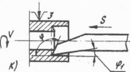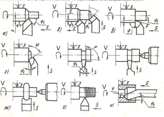 Рисунок 1. Работы выполняемые при точении различными резцами: а) проходным прямым; б) проходным отогнутым; в) упорным; г) подрезным; д) отрезным; е) прорезным; ж) фасонным; з) резьбовым; и) расточным проходным; к) расточным упорным.