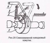 Указанных недостатков не имеет быстродействующие поводковые устройства современных конструкций, которые обеспечивают как правильную установку детали, так и передачу крутящего момента без использования хомутика (рис.23,г) (поводком для валиков малых диаметров может служить рифлёный поводковый центр "ёрш") На рис. 25 показан самозажимной хомутик. Кольцо 1 надевают на заготовку, установленную в центрах. При включении вращения шпинделя планшайба воздействует на поводок 4, который поворачиваясь на оси 2, захватывает заготовку рифлёной поверхностью. В исходное положение поводок возвращается пружиной 3.