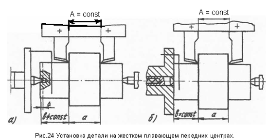 Схема установки детали на жестком переднем центре приведена на рис.24а на плавающем - на рис.24.б. При установке детали на жесткий передний центр и одновременной обработке торцов погрешность от установки для размера А равна нулю (рис.24.а). Для размера b от левого торца, являющегося исходной базой, эта погрешность будет равна Δ и определяется точностью центровых отверстий. При установке той же детали на плавающий передний центр (рис.24,6) положение левого торца вала для заготовок всей партии будет определяться упором и сохраняться постоянным относительно резцов, установленных на размеры а. и в.