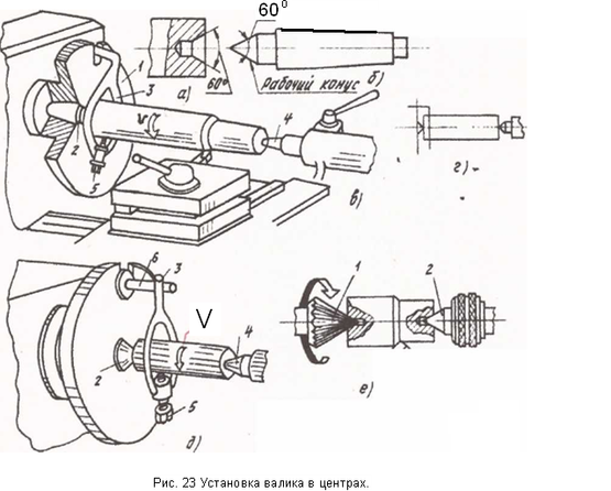 Рисунок 3. Установка валика в центрах: а) центровочное отверстие вала, б) центр, в) устройство установки в центрах, г) схема установки в центрах, д) устройство установки в центрах с другим поводком, е) установка на «ерш»
