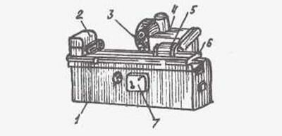 Круглошлифовальный станок (рис.59) имеет следующие узлы и детали: станина 1, которая служит основанием для всех узлов станка; рабочий стол 6, который перемещается по станине, обеспечивая продольную подачу заготовки; передняя бабка 2, которая расположена на столе станка и предназначена для установки детали и передачи ей вращения; задняя бабка 5, служащая для поддержания правого конца заготовки при шлифовании в центрах; шлифовальная бабка 4; несущая на шпинделе шлифовальный круг 6, получающий вращение от электродвигателя; панель управления 7, где собраны механизмы управления станком.