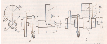 Рис.60 Схемы наружного круглого шлифования с продольной (а) и поперечной (б) подачей 1-патрон, 2- хомутик, 3- шлифовальный круг, 4- заготовка, 5-центр
