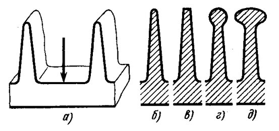 Напряжения можно регулировать также ребрами. Следует иметь в виду, что поперечные ребра (вид г) влияют на усадочные напряжения только по оси