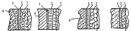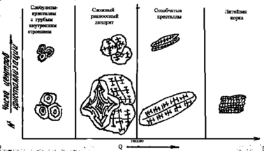 Рис.11 Влияние различных факторов на образование кристаллической структуры: 1- корка, 2- столбчатая зона, 3- крупная структура 4- форма.