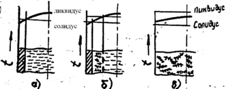Рис.12 Характер затвердевания сплава: а) последовательное, б)-двухфазное, в)- объемное.