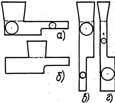 Отливки с резко изменяющейся толщиной стенки характеризуются тем же отношением Dmax /Dmin. Питание от прибыли толстой части зависит от подвода жидкого металла и расположения прибыли. На рис. 18 а, в прибыль прилегающая и поэтому наиболее эффективна, на рис. 18 б – полуприлегающая. На рис. 18 г узел находится в таком положении, что его нельзя питать из прибыли и в нем создается местное отрицательно направленное затвердевание.