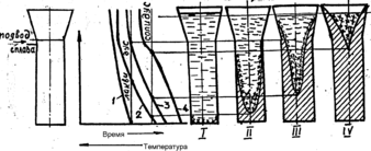 При направленном затвердевании кристаллизация отливки происходит последовательно в направлении от наиболее удаленных ее частей к источнику питания жидким сплавом, например, к прибыли. Сущность направленного затвердевания рассмотрим на примере формирования плоской вертикально расположенной в форме плиты с прибылью. Металл в форму подводится под прибыль. При этом в момент окончания заливки наиболее холодный металл будет в нижней части формы, а наиболее горячий- в прибыли. Это происходит потому, что при подводе сплава под прибыль первые его порции попадают в нижнюю часть отливки, где сразу же начинают охлаждаться, соприкасаясь с холодной формой. Прибыль же будет заполнена последними порциями сплава, температура которого приблизительна равна температуре заливки. Распределение температур по оси отливки по всей ее длине к моменту окончания заполнения характеризует кривая 1. В соответствии с этим распределением затвердевание отливки от боковых стенок начнется раньше в нижней и позже в верхней части. Кривые 2, 3 и 4 соответствуют II-у ,III-у и IV-у этапам затвердевания, которое идет вверх, то есть в направлении к прибыли (рис. 14). Такое затвердевание и называют направленным. При направленном затвердевании отливка получается плотной, без концентрированных раковин, которые вводятся в прибыль.