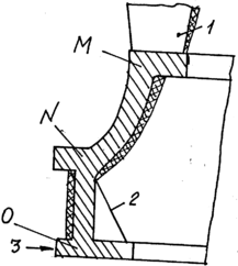 Сложная отливка содержит несколько узлов. Так, например, отливка на рис. 22 имеет три кольцевых узла M, N, O. Питание подведено в узел О, на котором еще есть ряд угловых узлов в местах сопряжения ребер 2. Узел М прилегает к прибыли и удален от подвода питания. Рассмотрим узлы по возможности их обезвреживания. Узел О не питается прибылью и так как он проточной его нельзя захолодить. Узел одновременно и проточной и сквозной, его нельзя надежно обезвредить захолаживанием. Узел М питается прибылью. Так как узлы О и N остаются без питания, то необходимо при данном подводе питания скорректировать сечение отливки. Вписывают в узел О наибольший шар и катят его по внутреннему контуру отливки до узла N. При этом придется несколько расширить сечение (указано штриховкой). Наибольший шар, вписанный теперь в узел N нужно теперь катить до узла М. Стенка между узлами N и М увеличивается (показано штриховкой). Это решение требует больших литейных припусков. Чтобы не увеличивать чрезмерно расход сплава достаточно усилить стенки только в местах расположения ребер.