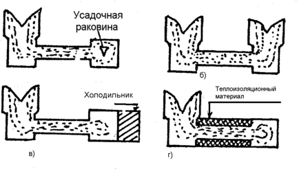 Для получения отливки без сконцентрированных в одном месте усадочных раковин необходимо, чтобы она затвердевала по одному из принципов: 1) одновременного затвердевания; 2) направленного затвердевания.