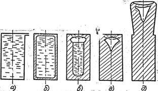 Рис.13 Образование усадочной раковины в отливке (а-д стадии процесса затвердевания).