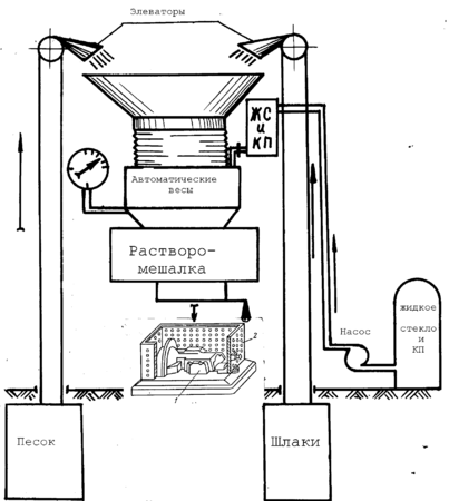 Приготовление ЖСС. Для изготовления жидкой смеси используют специальные смесительные установки. Схема смесительной установки показана на рис. 24. Дозирование компонентов формовочной смеси осуществляется на весах, вмонтированных в смесительную установку. Сначала в растворомешалку поступают сухие компоненты - песок и шлак, перемешиваются в течение 1,0- 1,5 мин. Для достижения требуемой степени однородности. После этого в смеситель вводится жидкая композиция и производится перемешивание в течение 1,5- 2,0 мин. Цикл приготовления смеси длится 3- 6 мин., происходит пенообразование и смесь приобретает текучесть и способность легко проникать во все щели и углубления формы самотеком.