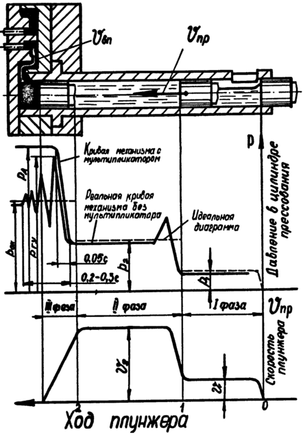 В момент окончания заполнения полости формы (точка 2) движущая система – жидкий сплав, прессующий плунжер, мгновенно останавливается. Энергия движения преобразуется в энергию давления, происходит гидравлический удар, величина которого ргу обычно в два раза больше, чем давление в аккумуляторе. Гидравлический удар полезен и в тоже время вреден.