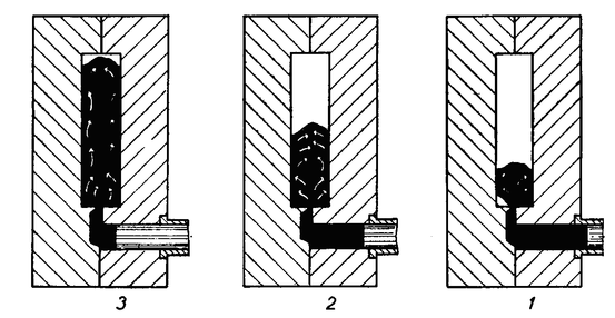Особенности способа. Процесс литья под давлением осуществляется в три фазы: 1 – медленное движение плунжера до момента поступления сплава в литниковую систему, воздух из камеры через полость формы выгоняется в атмосферу; II – заполнение сплавом с большой скоростью полости формы; III – затвердевание отливки (см. рис. 4.3).
