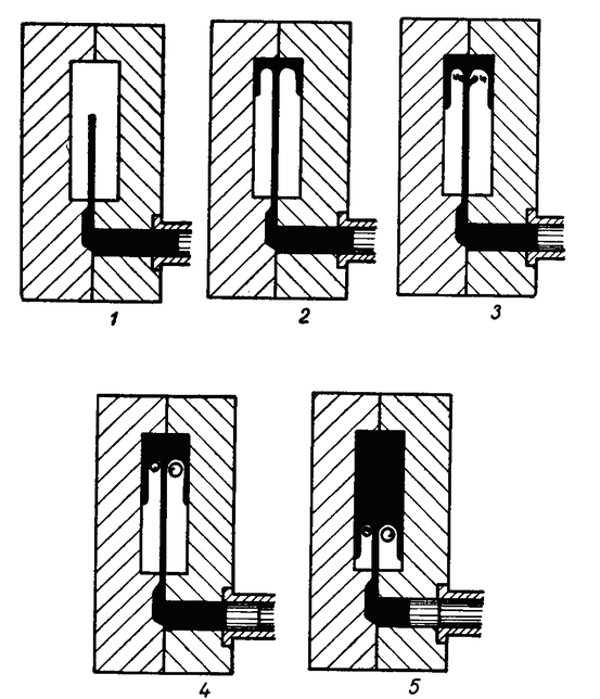 Давление в форме увеличивается пропорционально отношению квадрата диаметров поршня и плунжера Схему процесса и последовательность действий иллюстрирует рис.4.2