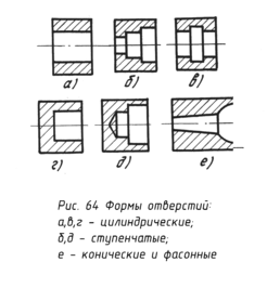 Отверстия в деталях приборов бывают цилиндрические (Рис. 64 а, в, г), ступенчатые (Рис. 64 б, д), конические и фасонные (Рис. 64, е).