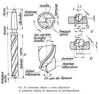Спиральное сверло (Рис. 65, а) - инструмент цилиндрической формы, на поверхности которого имеются две винтовые канавки, образующие режущие кромки. Сверло состоит из рабочей части и хвостовика, соединенных между собой шейкой. Хвостовик служит для закрепления сверла в патроне или шпинделе станка. Хвостовики бывают конические и цилиндрические.