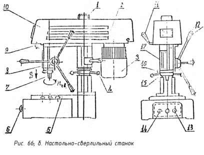 В приборостроении наибольшее распространение получили настольно-сверлильные станки (Рис. 66, а). и вертикально-сверлильные (Рис. 66,ба),на которых обработка осуществляется по первому способу.