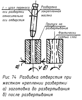 онструктивные особенности разверток таковы, что в процессе работы они испытывают большие радиальные и незначительные осевые нагрузки, сами стремятся установиться по отверстию и не обеспечивают точности направления оси отверстия. Поэтому для обеспечения точности направления оси отверстия его перед развертыванием необходимо обработать резцом или другим инструментом с принудительным центрированием и точным направлением .Короче, развертка не обеспечивает точность координирующего размера. Если развертка закреплена жестко, то незначительная несоосность с осью отверстия вызывает неравномерное срезание припуска: отверстие будет иметь больший диаметр у концов и меньший в середине (Рис. 74 а, б).