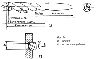 Зенкерование служит для увеличения диаметра предварительно подготовленного отверстия (литого, штампованного, просверленного). Для получения отверстий точностью до H11 с шероховатостью поверхности до Ra 2,5 операция зенкерования может быть окончательной и предварительной - перед развертыванием. Зенкерование применяют также для обработки фасок, цилиндрических и конических углублений под головки заклепок, винтов и болтов и зачистки торцовых поверхностей