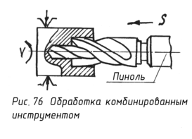 .Обработка отверстий комбинированным инструментом применяется в серийном и массовом производствах в целях повышения производительности и улучшения качества обработки деталей. Она осуществляется комбинированным инструментом, который позволяет совместить в один рабочий ход последовательно черновую и чистовую обработку одной поверхности, совместить различные операции: сверление и зенкерование, зенкерование и развертывание, развертывание и нарезание резьбы и т.д.