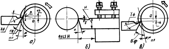 зависят не только от заточки, но и от установки резца относительно центра заготовки. Резец должен устанавливаться по центру заготовки (рис. 8, б). При установке резца выше центра, плоскость резания, как касательная к поверхности резания, изменяет свое положение, т.е. поворачивается на угол