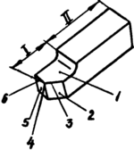 Рис. 5. Элементы токарного прямого проходного резца: 1-передняя поверхность; 2-задняя поверхность; 3-главное режущее лезвие; 4-вершина резца; 5-вспомогательная задняя поверхность; 6-вспомогательное режущее лезвие.