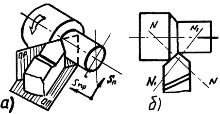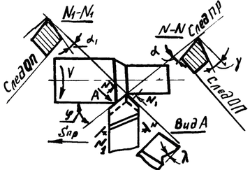 Вспомогательная секущая плоскость (N1-N1) – плоскость, перпендикулярная к проекции вспомогательного режущего лезвия на основную плоскость. На рис. 6, б показаны следы плоскостей N-N и N1-N1.