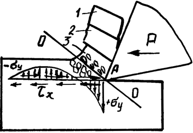 Рис. 10. Схеме упругонапряженного состояния металла при обработке резанием и процесс образования стружки.