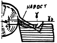 . Поэтому с появлением нароста деформации обрабатываемого металла снижается и мощность, расходуемая на резание, уменьшается. Помимо этого, нарост прикрывает собой самую ответственную часть инструмента – режущую кромку предохраняя её от разрушительного действия стружки. Стружка сначала скользит по наросту и только в его конце опирается непосредственно на переднюю поверхность резца. Иногда вершина нароста сильно выдаётся за режущую кромку; в этом случае режет нарост, а режущая кромка не соприкасается с поверхностью резания и со стружкой.