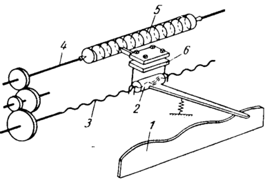 При вращении шпинделя 4 с заготовкой 5 вращается ходовой винт 3. Маточная гайка 2 через рычаг упирается в коррекционную линейку 1. В зависимости от профиля линейки (подъем или спад) маточная гайка (кроме продольного перемещения) имеет дополнительно доворот в ту или другую сторону, соответственно ускоряя или замедляя продольное движение суппорта, несущего резцедержатель 6. Таким образом, шаг нарезаемой резьбы получается равномерным.