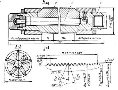 кулярные резьбы после нарезания калибруются метчиками и плашками. В последнее время метчики начинают применять для нарезания многозаходных резьб без предварительной их обработки резцами и гребенками. На рис. 22 показана конструкция разжимного метчика для нарезания 15-ти заходной резьбы с шагом 1мм. Метчик состоит из 5-ти ножей 2, установленных в корпусе 1, центрируемых коническим валиком 3. Резьбовую поверхность метчика обрабатывают в Рис.22 Метчик для нарезания окулярной резьбы.