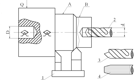 На рис. 2 показана обработка детали на токарно-револьверном станке за одну операцию. Поверхности А и В обрабатываются точением блоком 1 из 2-х резцов, поверхность С обрабатывается последовательно сверлом 2, зенкером 3 и разверткой 4, поверхность D сверлением. Здесь: одна операция, два установа, один показан на рисунке, второй при повороте заготовки чтобы отверстие D встало в рабочую зону, пять переходов (обработка поверхности A и B – один переход). Как видно процессов обработки много, а операция одна.