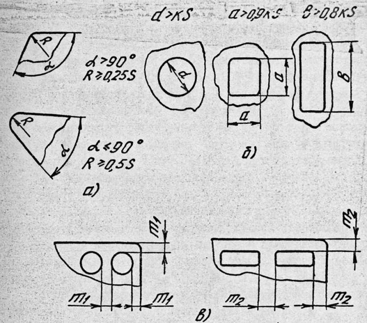При применении цельных матриц, вырубке с перемычками, пробивке выполнять плавное сопряжение пересекающихся элементов контура детали (рисунок 9,а). Минимальные радиусы сопряжения углов: при