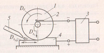 1 — электрод-инструмент; 2 — токосъемник; 3— выпрямитель;