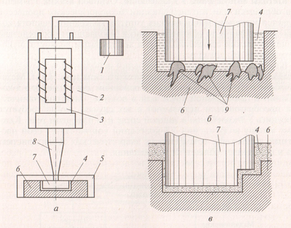 а — принципиальная схема; б — схема съема материала при ультразвуковом прошивании; в — схема воспроизведения профиля инструмента в заготовке; 1 — генератор тока повышенной частоты; 2 — корпус магнитостриктора с охлаждающей водой; 3 — магнитостриктор (пакет с обмоткой); 4 — зазор, заполненный суспензией абразива; 5 — ванна; 6— обрабатываемая заготовка; 7— инструмент; 8 — концентратор-волновод (трансформатор амплитуды); 9— частички абразива