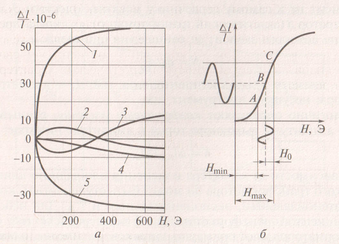 Величина относительного удлинения зависит от упругих и электромагнитных характеристик материала, а также от напряженности магнитного поля
