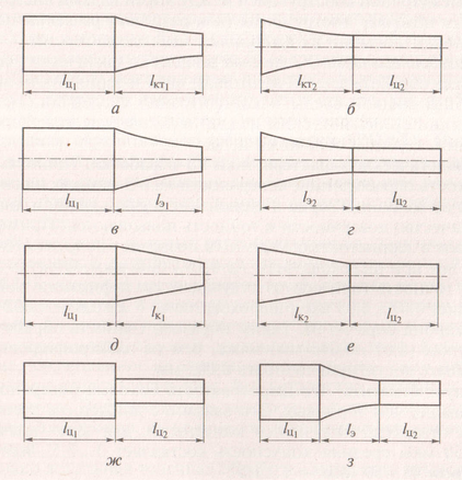 а — катеноидальный рупор, соединенный широкой частью с цилиндрической частью; б — то же, с узкой частью; в — экспоненциальный с узкой частью; г — то же, с широкой частью; д — конический, с широкой частью; е — то же, с узкой частью; ж — ступенчатый цилиндрический; з — ступенчатый с небольшим переходным стержнем для приваривания заготовки; /ц , /К1 , /3 , /к — соответственно длина цилиндрической, катеноидальной, экспоненциальной, конической части; /, — длина переходника