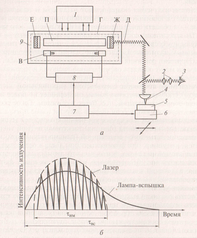 1 — блок охлаждения; 2 — наблюдательная система; 3 — глаз; 4 — оптическая система; 5 — заготовка; 6 — рабочий стол; 7 — блок управления; 8 — источник питания лампы накачки; 9 — лазерная головка; П — активный элемент; Е, Ж — глухое и полупрозрачное зеркала резонатора; В — лампа-вспышка; Г — рефлектор; Д — лазерный луч; τии — длительность импульса излучения лазера; τис — длительность импульса лампы-вспышки