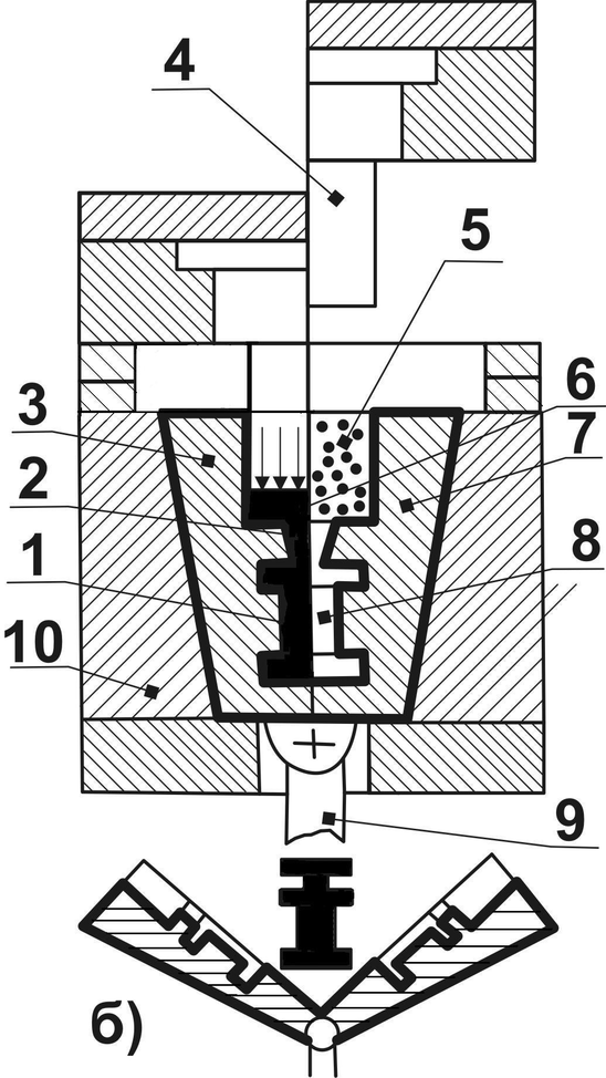1- деталь, 2- литник, 3- разъемная подвижная матрица, 4- плунжер, 5- гранулы, 6- прессостаток, 7- загрузочная камера, 8- полость формы, 9- толкатель, 10-корпус.