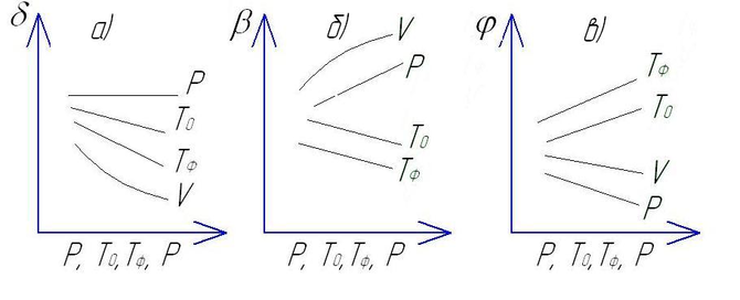 Рис.8. Влияние температуры материала To, формы Tф скорости впрыска V и давления P на толщину слоев: а) – наружного; б) – среднего, в) – внутреннего.
