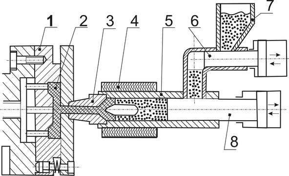 форма, 2- деталь, 3- сопло, 4- обогреватель, 5- нагревательный цилиндр, 6- дозирующий плунжер, 7- бункер, 6- прессующий поршень.