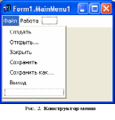 Двойным щелчком на значке MainMenu1 откройте Конструктор меню (см. рис. 2), дайте первому пункту строки меню название Файл, а первому пункту его подменю название Создать.